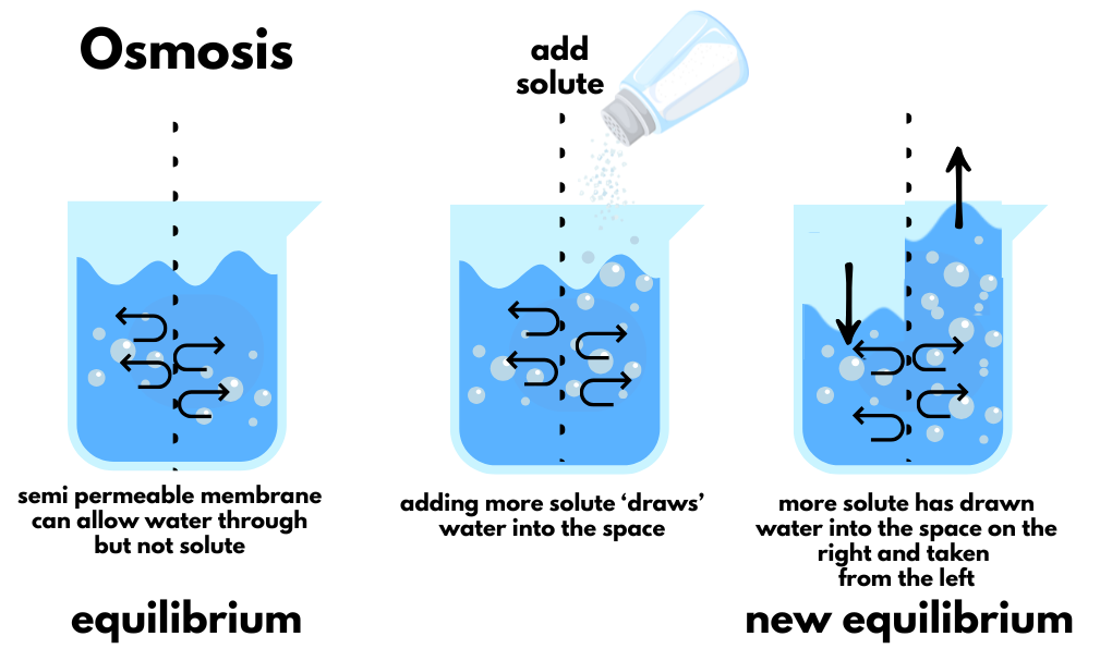 Osmosis is water's irresistible urge to dilute concentrated solutions. Picture a beaker divided by a semipermeable membrane (fancy speak for "lets water through but blocks bigger stuff"). Start with equal water levels on both sides. Now dump salt on one side. The salt can't cross the membrane, but water can—and will.