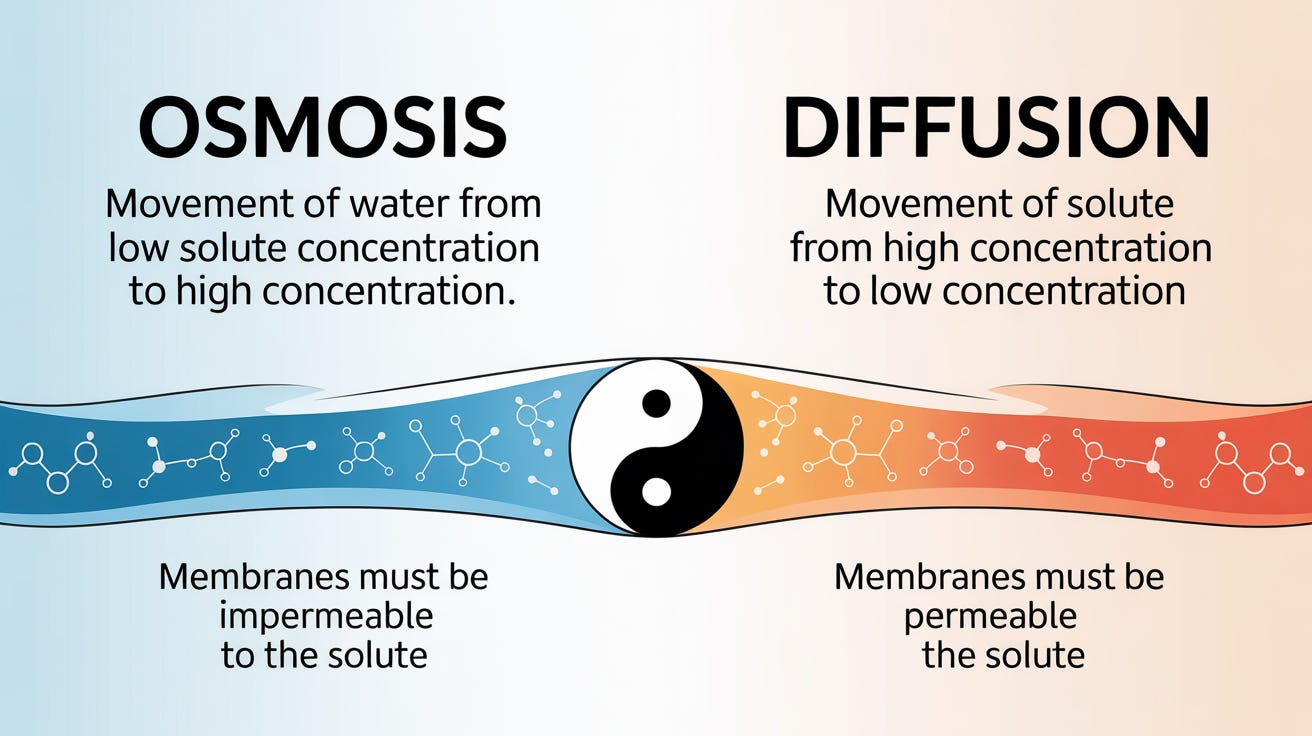 Before we dive deeper into IV fluids and why some make you swell like a water balloon while others barely register, let's get our heads around the two fundamental forces that move water and particles around your body: osmosis and diffusion.