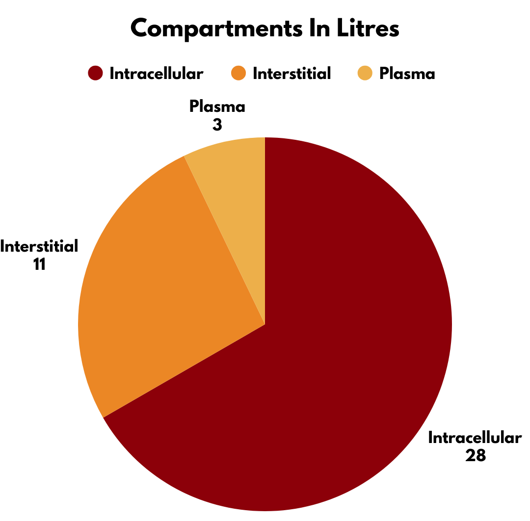 One-third is outside the cells (the extracellular compartment: 14 litres), split into: