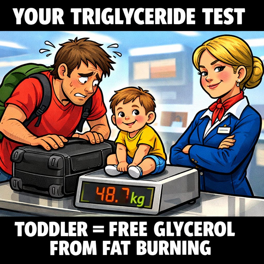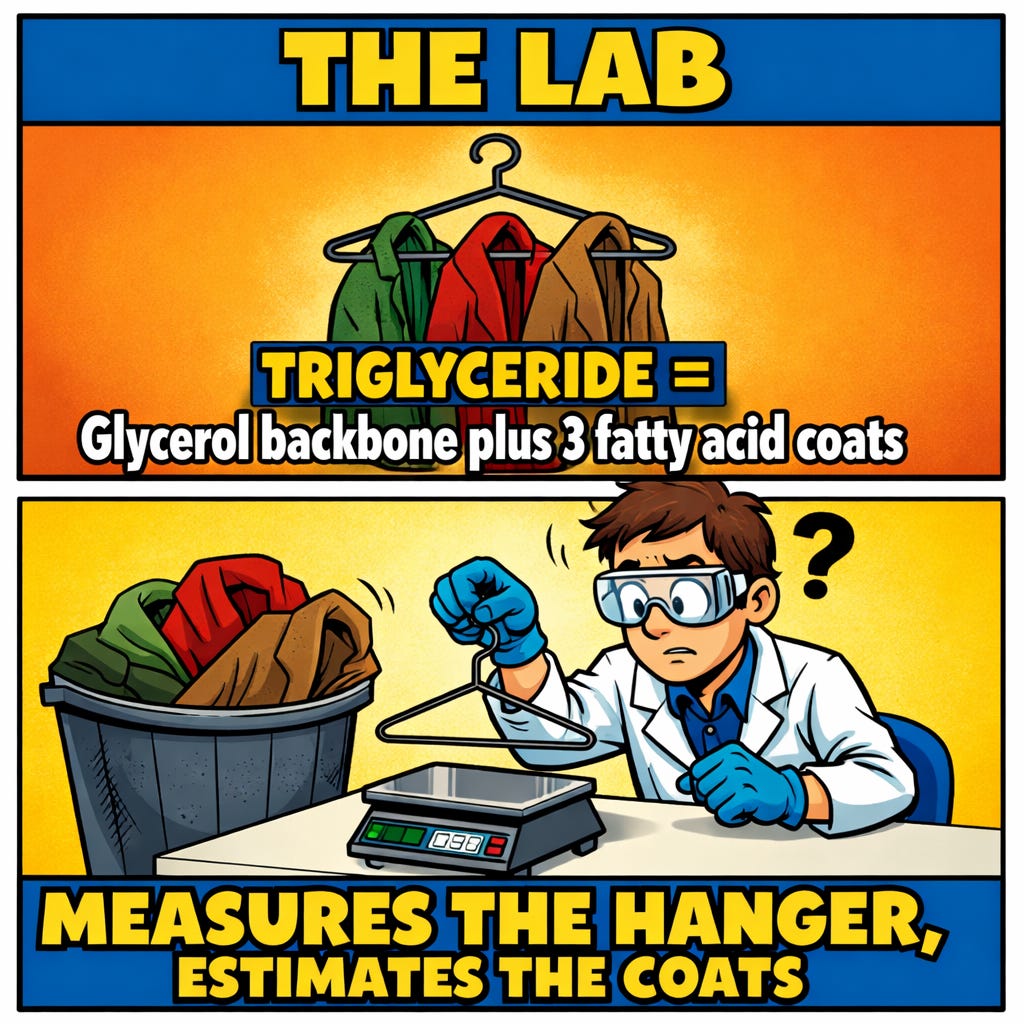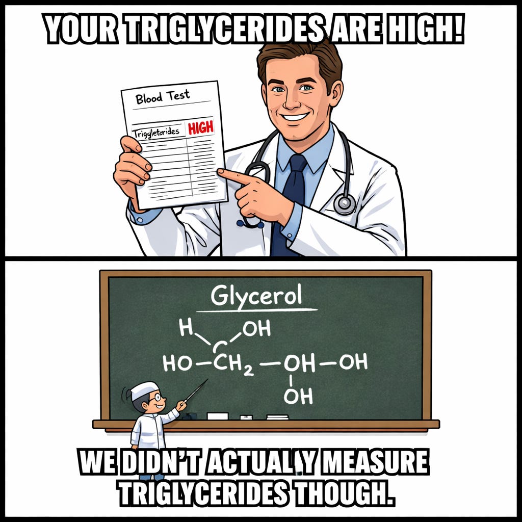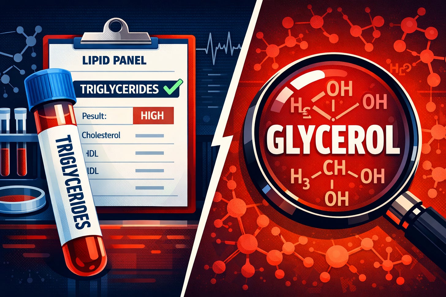 When the assay breaks your triglycerides apart to measure glycerol, it’s also picking up all that pre-existing free glycerol from lipolysis. And since the test assumes all glycerol came from triglycerides, it inflates the reading. Your result comes back higher than your actual triglyceride level. You look at the number and panic. Your doctor looks at the number and reaches for a prescription pad.